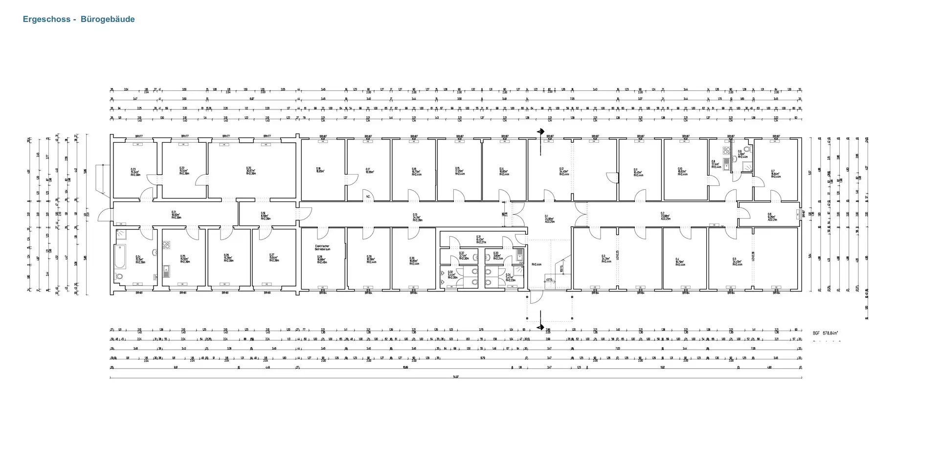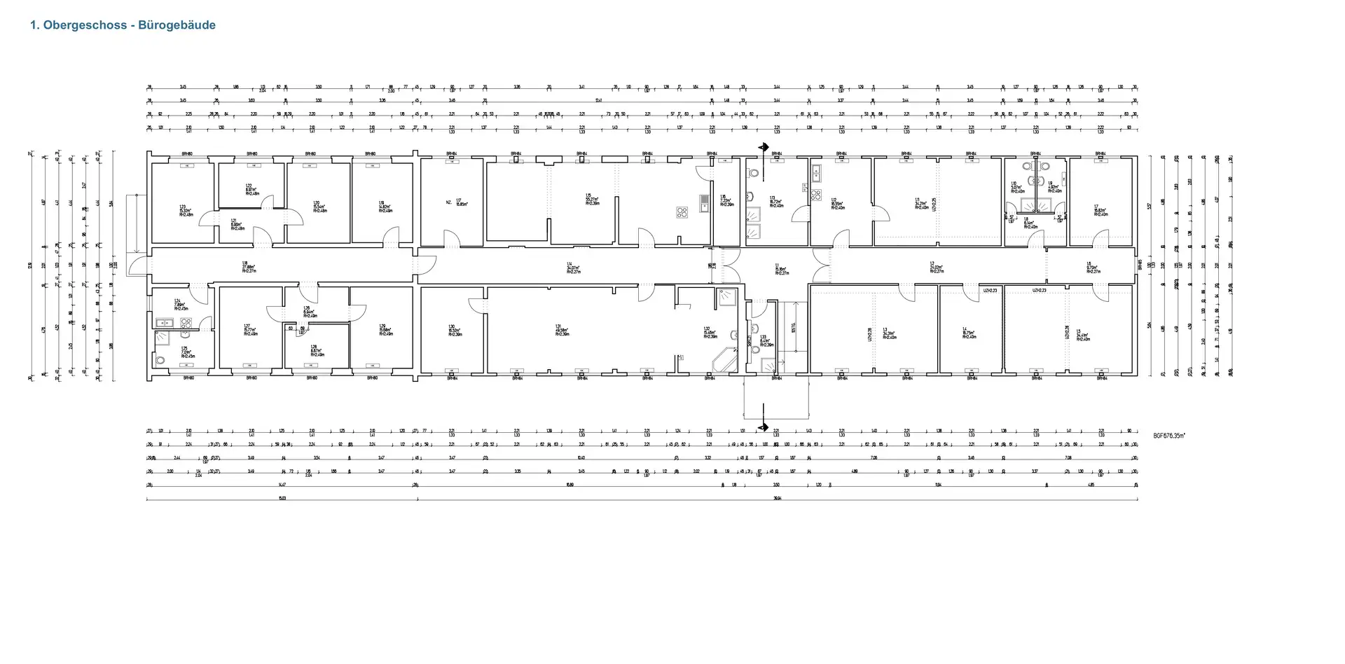 Auf insgesamt ca. 1.354 m² verteilen sich 42 Bürozimmer auf zwei Etagen – Erdgeschoss ca. 676 m² und 1. Obergeschoss ca. 678 m². Die Räume sind hell, funktional geschnitten und lassen sich flexibel ab einem einzelnen Zimmer anmieten.